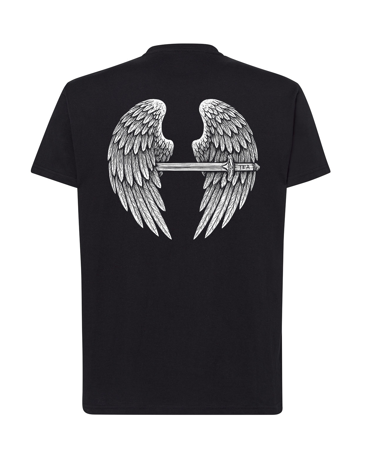 Impreso en blanco de un par de alas con una espada en el centro en la parte trasera de la camiseta.