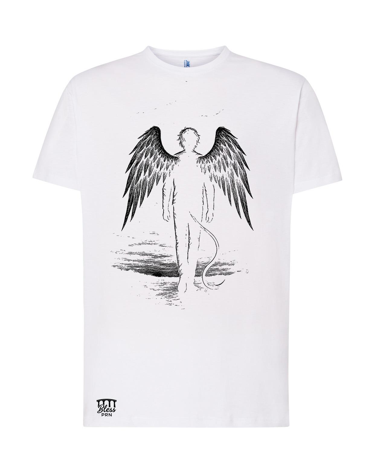 Descripción del Diseño: La camiseta presenta un diseño artístico de un ángel con alas extendidas, lo que puede simbolizar pureza, protección o espiritualidad. El contraste entre el blanco de la camiseta y la imprimación en negro hace que el diseño sea prominente y fácilmente reconocible.