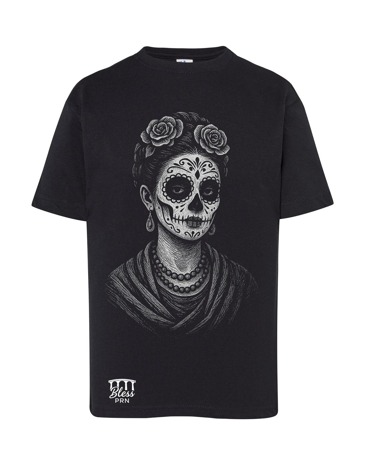 Descripción del Diseño: La camiseta presenta un diseño artístico de una calavera, probablemente inspirada en el Día de Muertos, una festividad tradicional de México. La calavera está decorada con dibujos delicados y adornos florales, lo que le confiere un aspecto elegante y sofisticado. El contraste entre el negro de la camiseta y la imprimación en blanco hace que el diseño sea prominente y fácilmente reconocible.