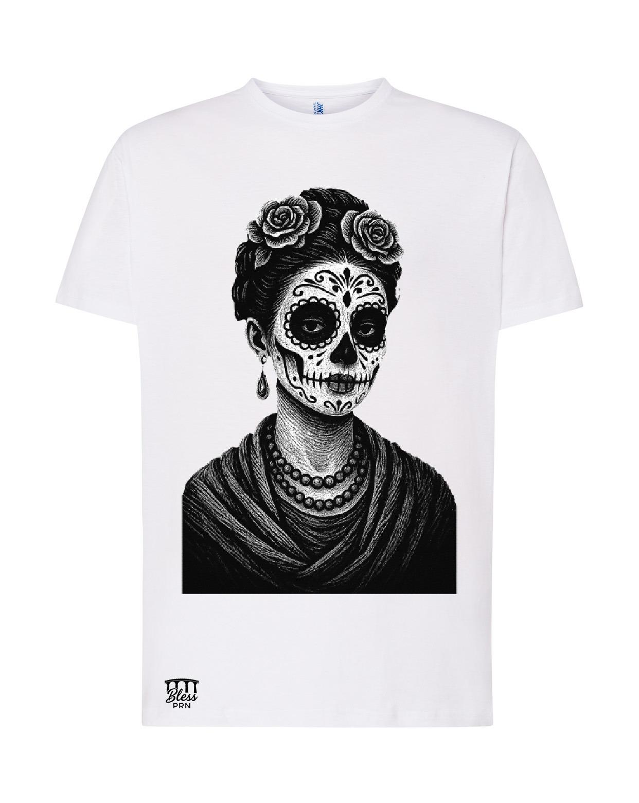 Descripción del Diseño: La camiseta presenta un diseño artístico de una calavera, probablemente inspirada en el Día de Muertos, una festividad tradicional de México. La calavera está decorada con dibujos delicados y adornos florales, lo que le confiere un aspecto elegante y sofisticado. El contraste entre el blanco de la camiseta y la imprimación en negro hace que el diseño sea prominente y fácilmente reconocible.