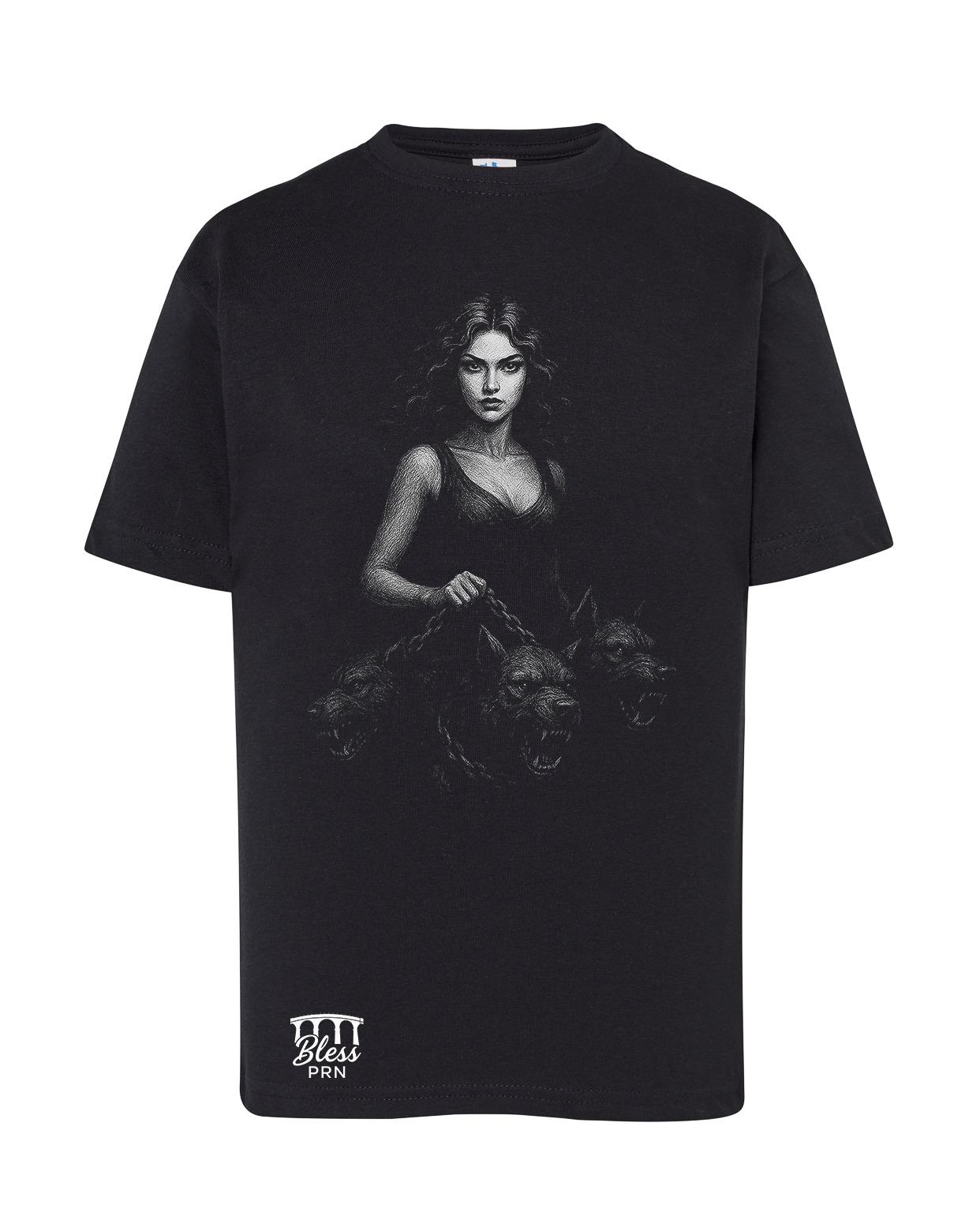 Descripción del Diseño: La camiseta presenta un diseño artístico de una dama con cabello rizado y vestido oscuro, rodeada de lobos, lo que puede simbolizar una conexión con la naturaleza o un estilo místico y poderoso. El contraste entre el negro de la camiseta y la imprimación en blanco hace que el diseño sea prominente y fácilmente reconocible.