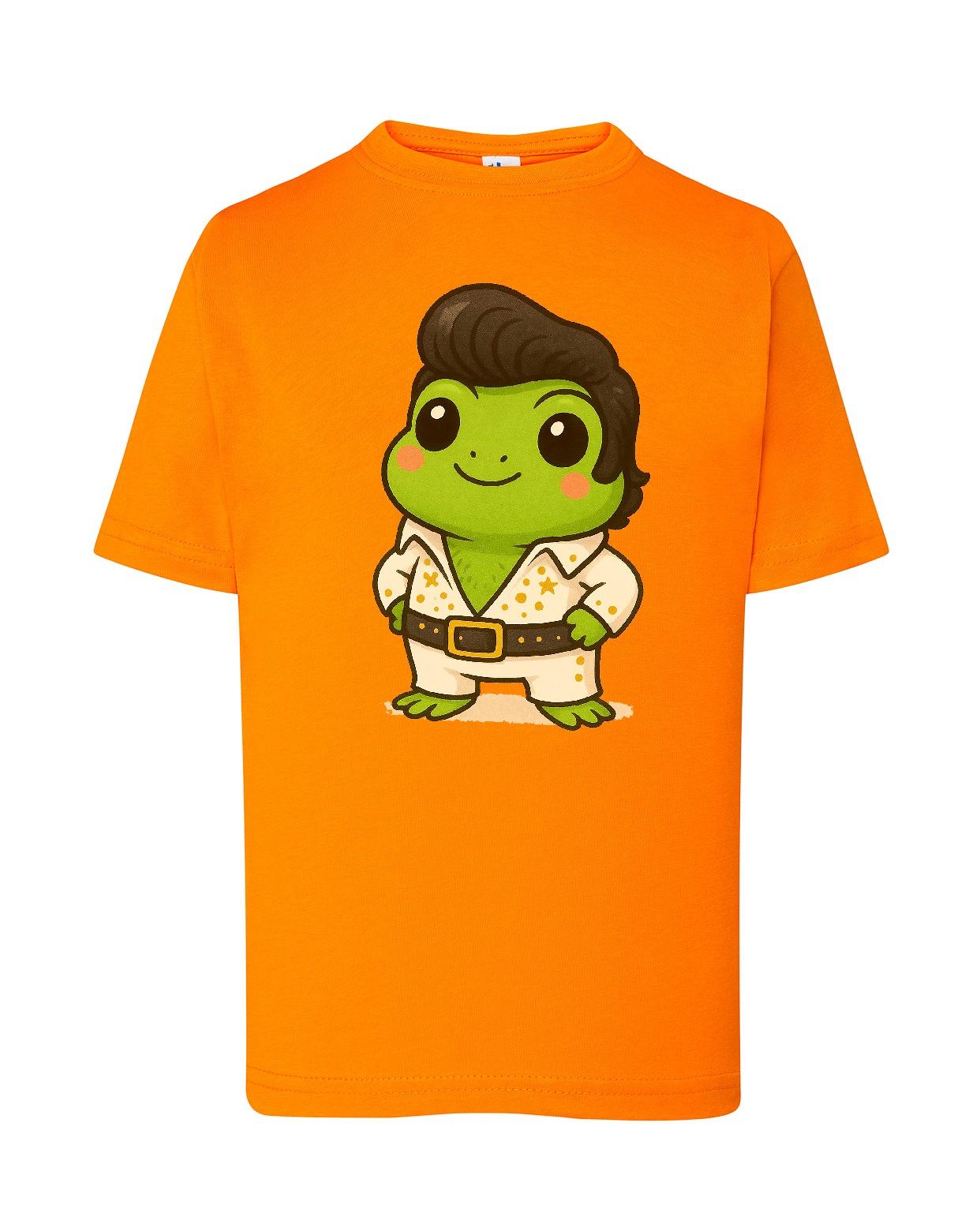Impreso en color naranja de una rana al puro estilo de Elvis Presley un atuendo de estrella de rock.