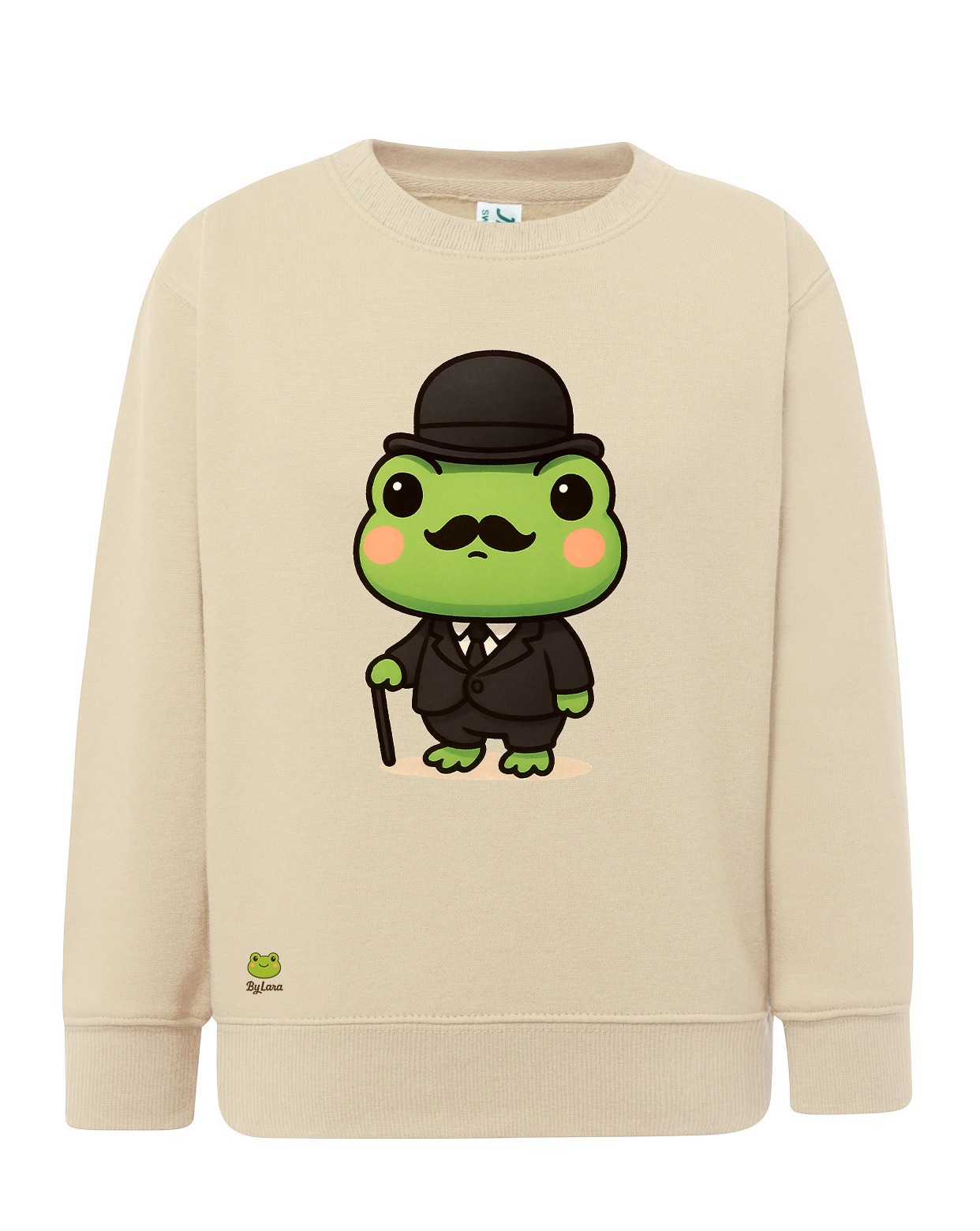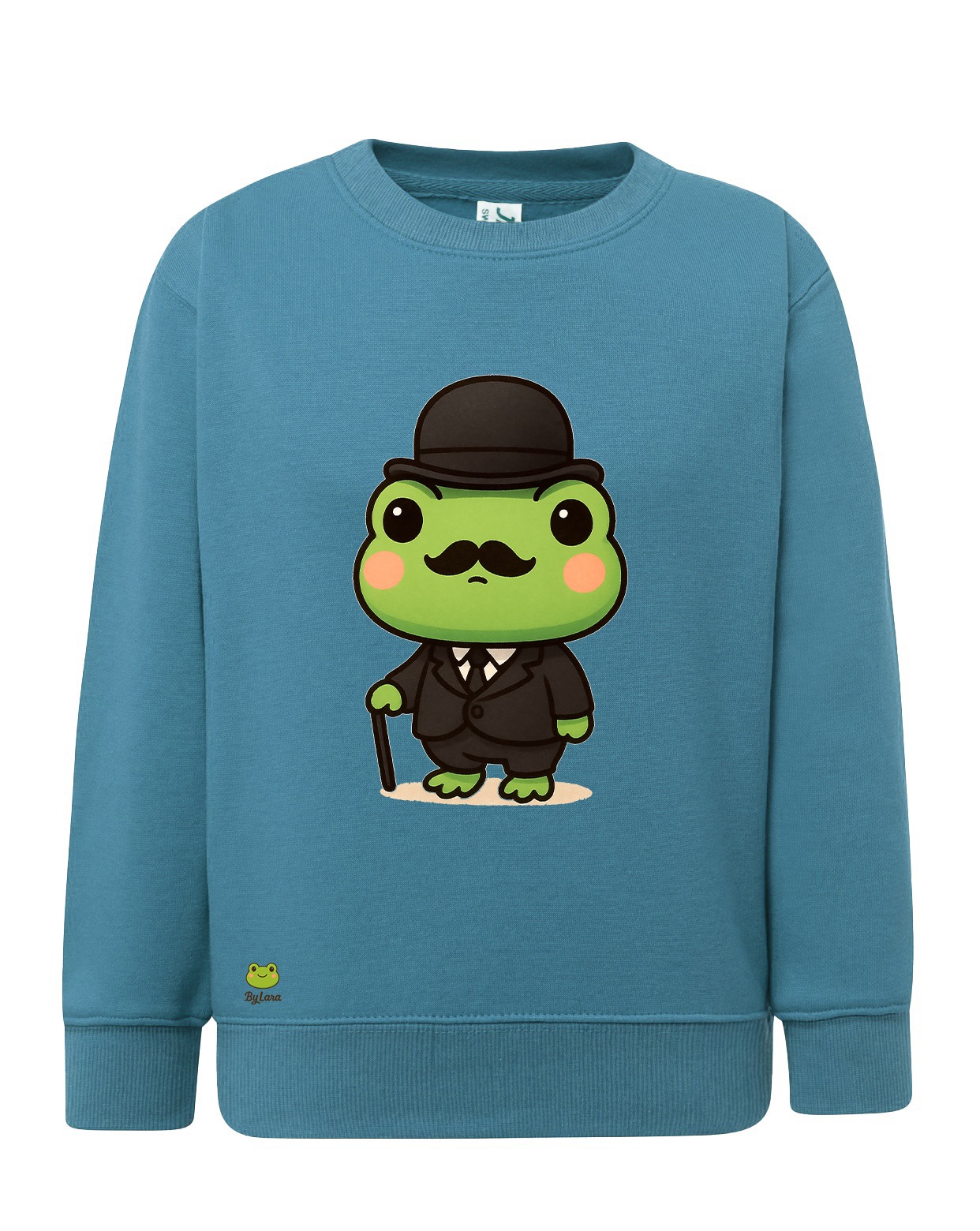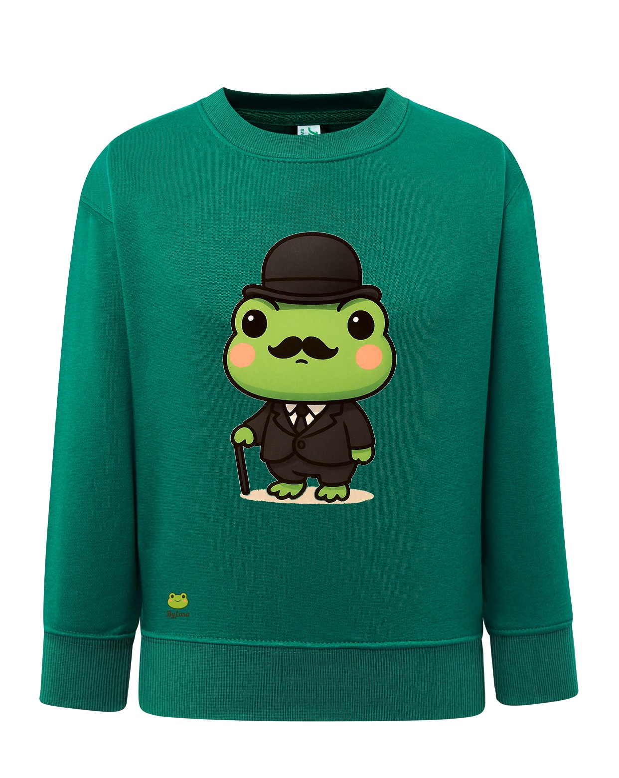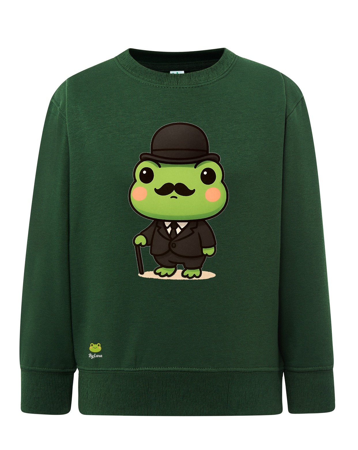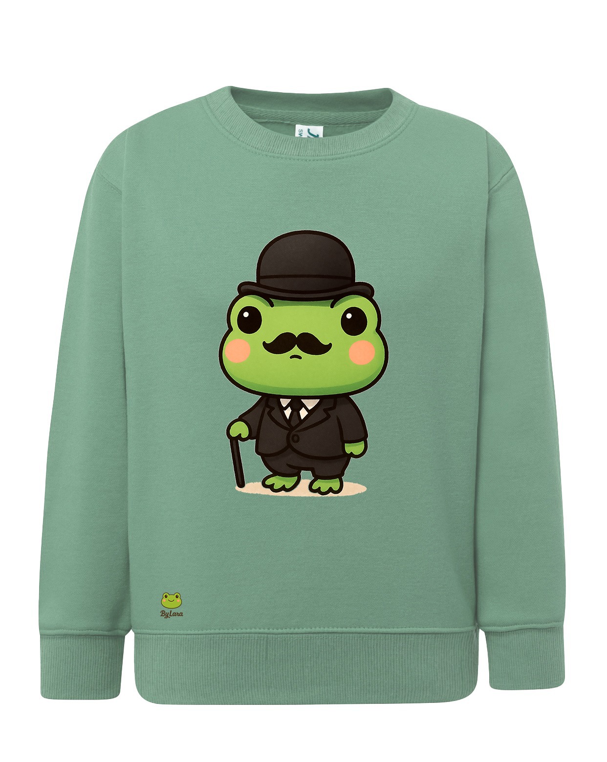 Descripción del Diseño: La sudadera presenta un diseño divertido y original de una rana con un sombrero y bigote, vestida con un atuendo de detective. El verde pastel de la sudadera combina perfectamente con el atuendo de la rana, haciendo que el diseño sea prominente y fácilmente reconocible.